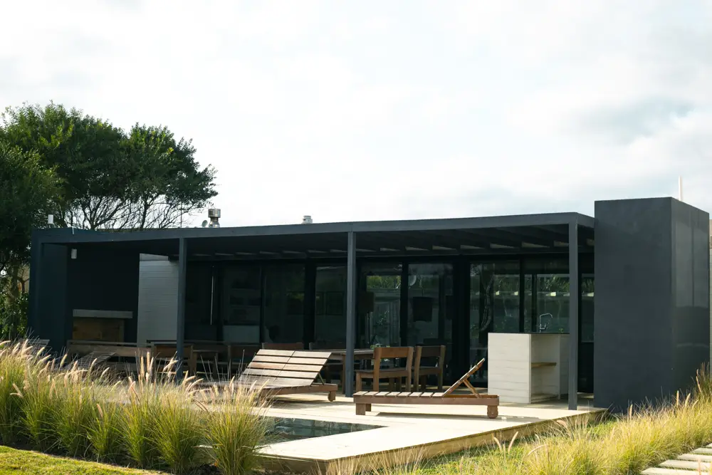 Con una distribución en forma de L, la casa ha sido diseñada para maximizar la privacidad y la integración con los espacios exteriores. La sección larga de la estructura alberga dos niveles, mientras que la sección corta, de una sola planta, es el corazón social del hogar: un amplio living que fluye naturalmente hacia el parrillero exterior. Este, a su vez, se abre auna espectacular piscina privada, creando un ambiente perfecto para el relax y el entretenimiento al aire libre.