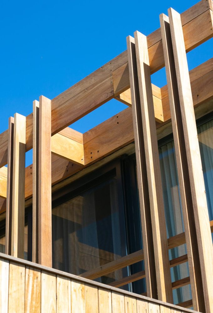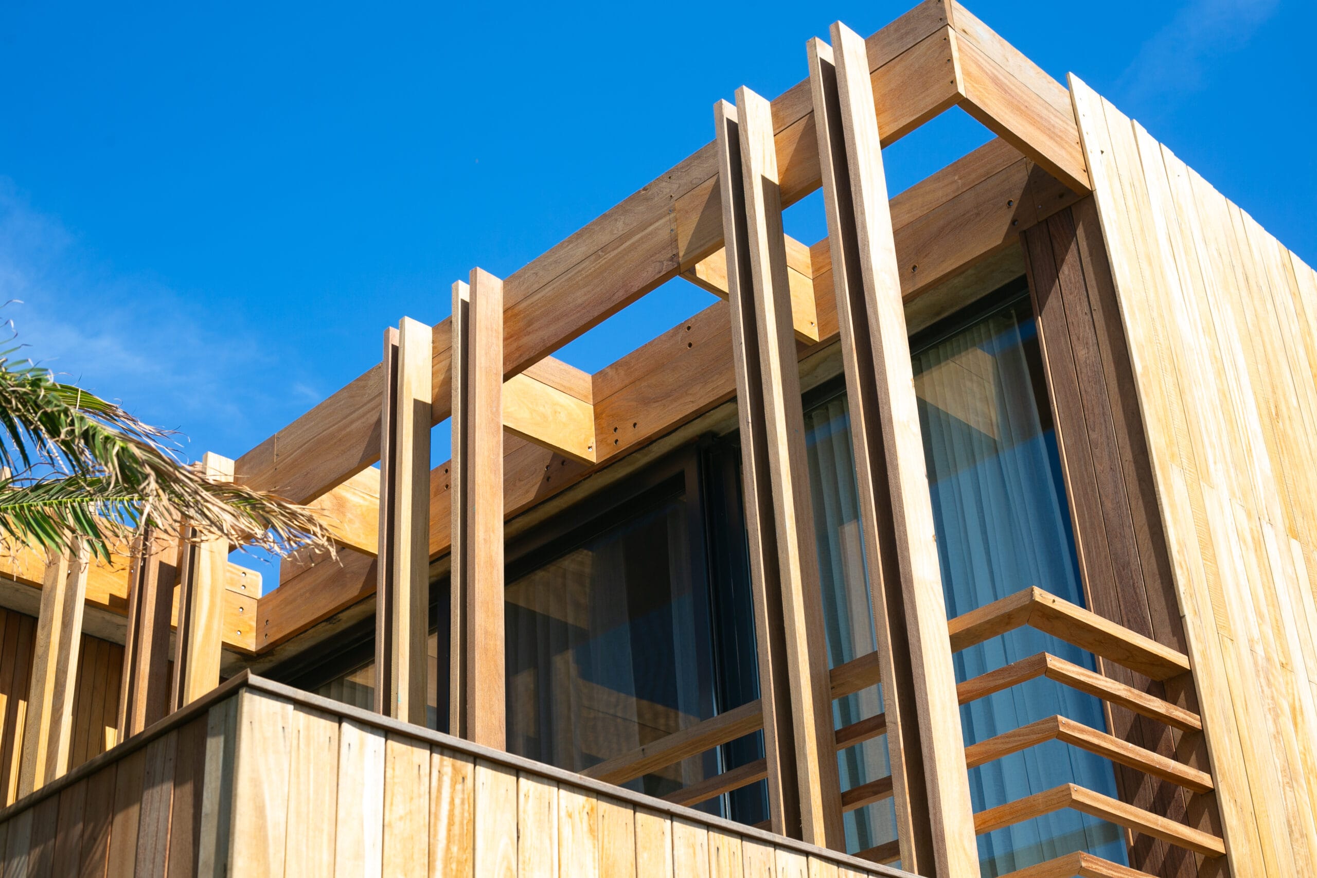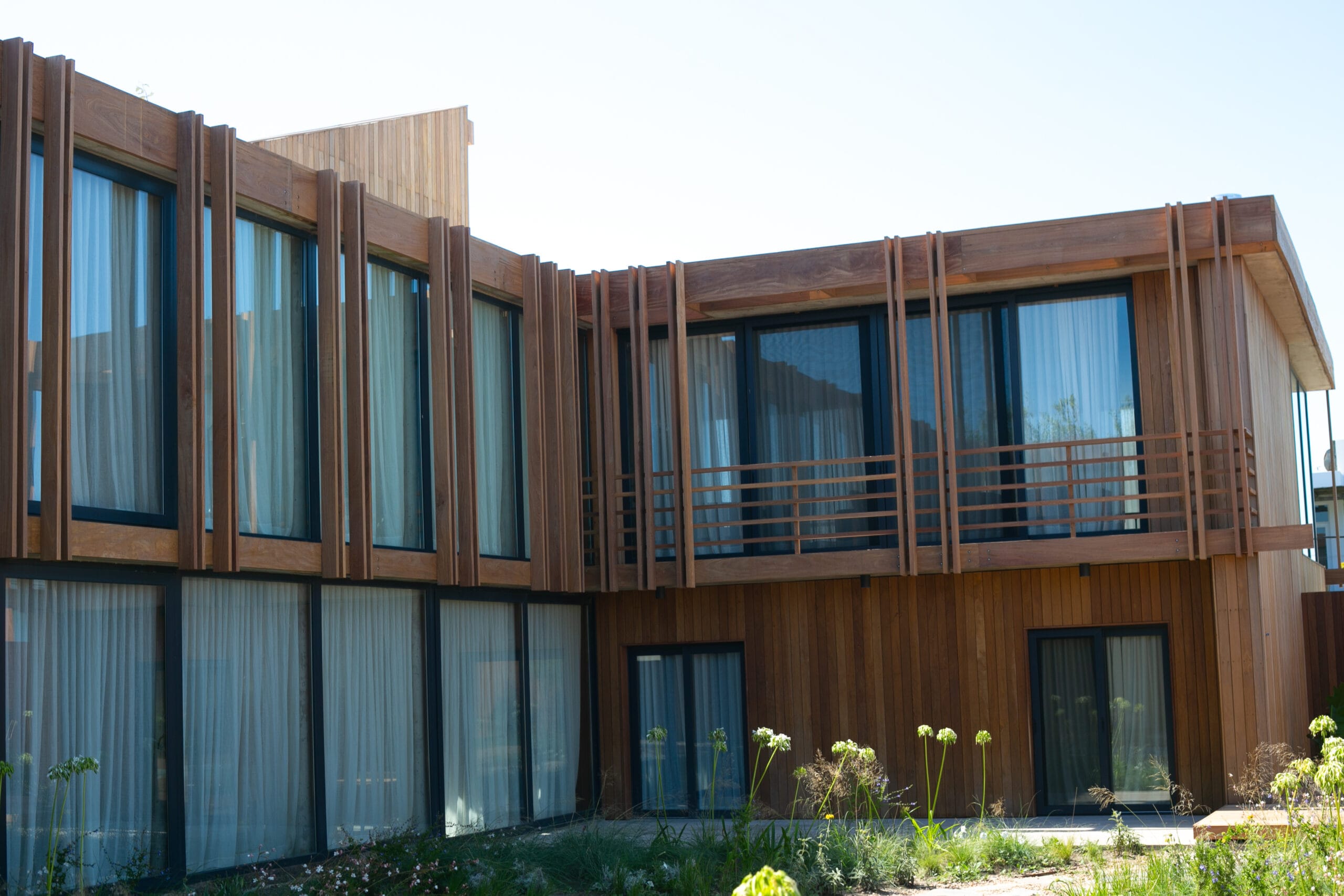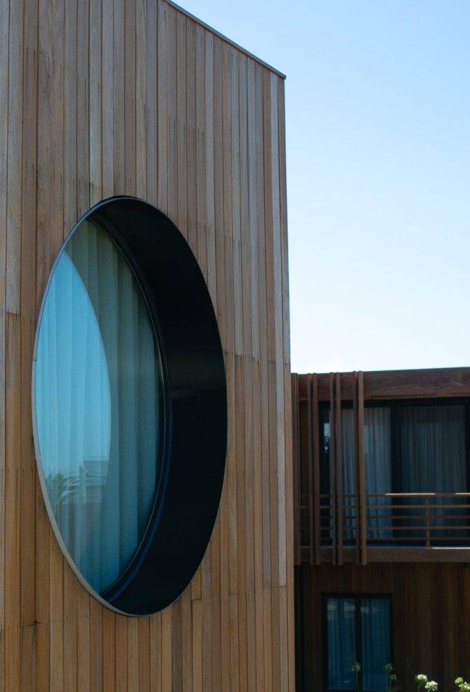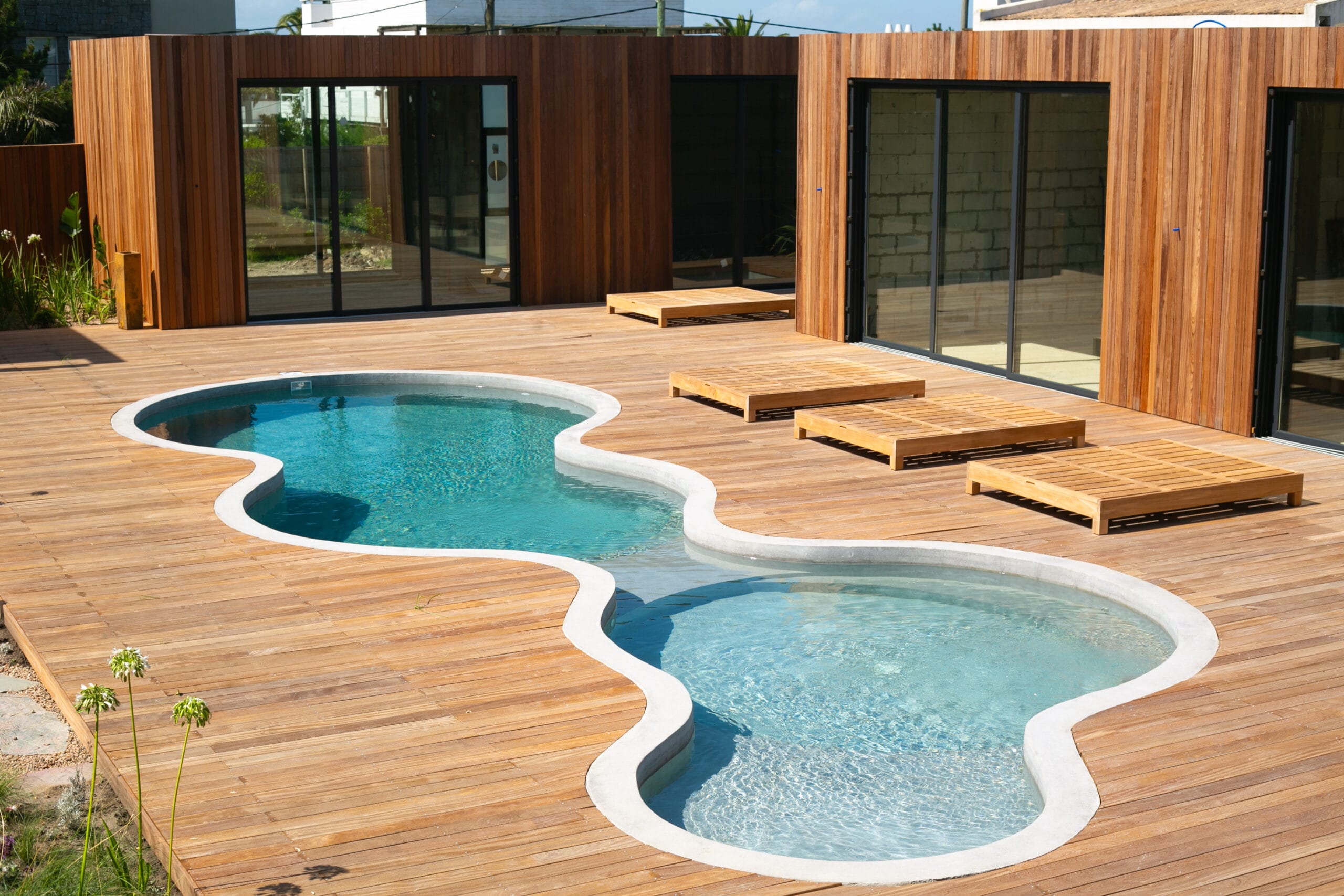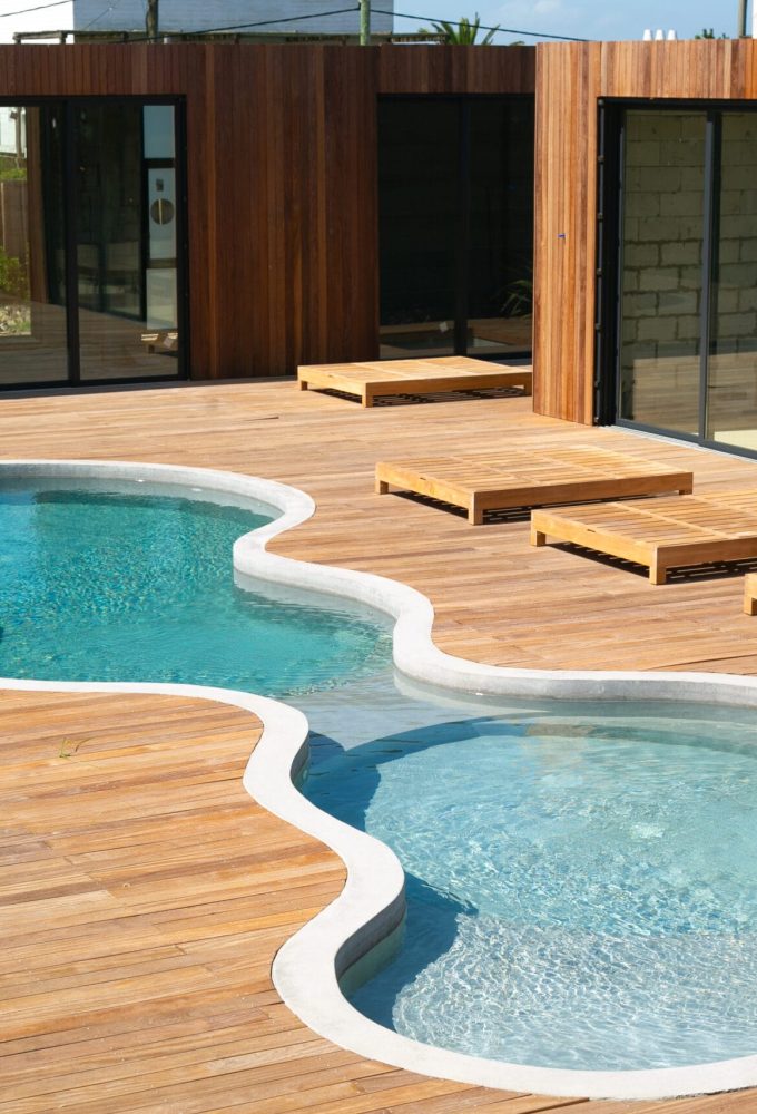 En el corazón de la propiedad se presenta una piscina de forma abstracta, seguido por tres estructuras independientes pero interconectadas – un parrillero, un sauna y un gimnasio – complementan la experiencia de vida al aire libre, todos ellos revestidos de lapacho y con ventanales de piso a techo que proporcionan un flujo visual continuo entre los espacios, permitiendo disfrutar tanto del interior como del exterior con la misma intensidad. Cada uno de estos espacios está diseñado para ofrecer comodidad y privacidad, permitiendo disfrutar del tiempo libre de una manera única.